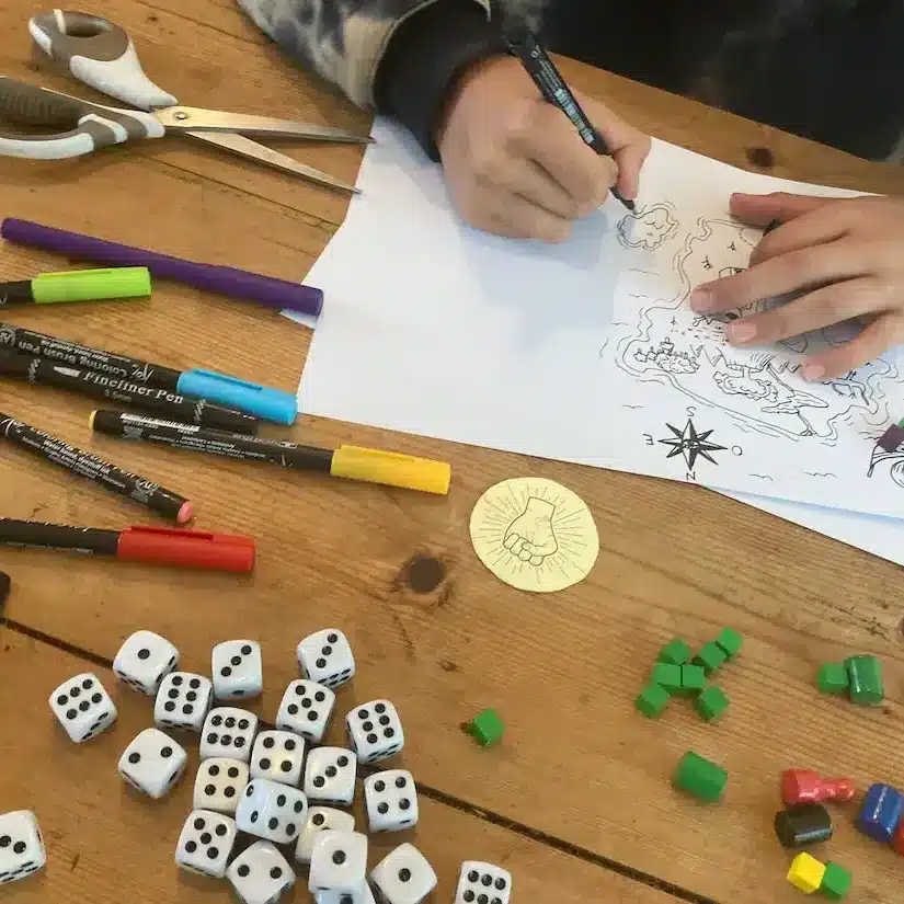 Chaque enfant réalisera un prototype artisanal unique, en utilisant du papier épais, feutres, crayons, mais aussi du matériel spécifique (dés, pions, meeples…). La règle du jeu sera imprimée pour donner à leur création une vraie clarté et un rendu professionnel.
