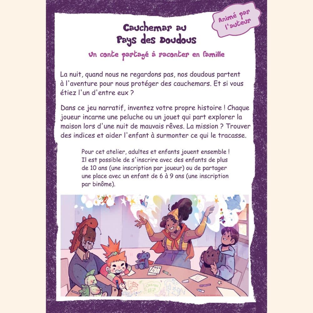 Les participants construisent une aventure où les doudous deviennent des héros, partant en mission pour affronter les peurs nocturnes et protéger les enfants.